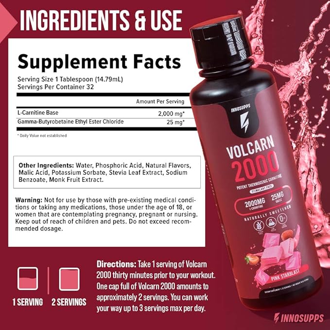 InnoSupps Volcarn 2000 - L-CARNITINE Advanced Energy Liquid | ATP Enhancer with GBEEC | Boosts Energy, Enhances Focus, Caffeine Free, No Artificial Sweeteners | 32 Servings (Pink Starblast)