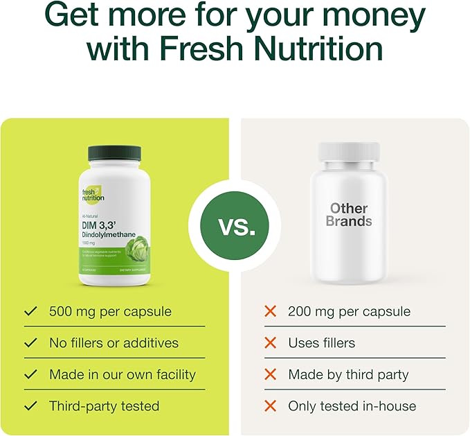 - Fresh Nutrition's DIM supplement features a consistent dosage of 500mg per serving, verified for quality through independent third-party testing. Each bottle contains 90 capsules, designed for a one-month supply based on the recommended intake of three capsules daily. Manufactured in the USA in a cGMP and FDA-registered facility, our DIM supplement is produced with high standards, using carefully sourced ingredients without fillers or additives. Additionally, each product undergoes third-party t