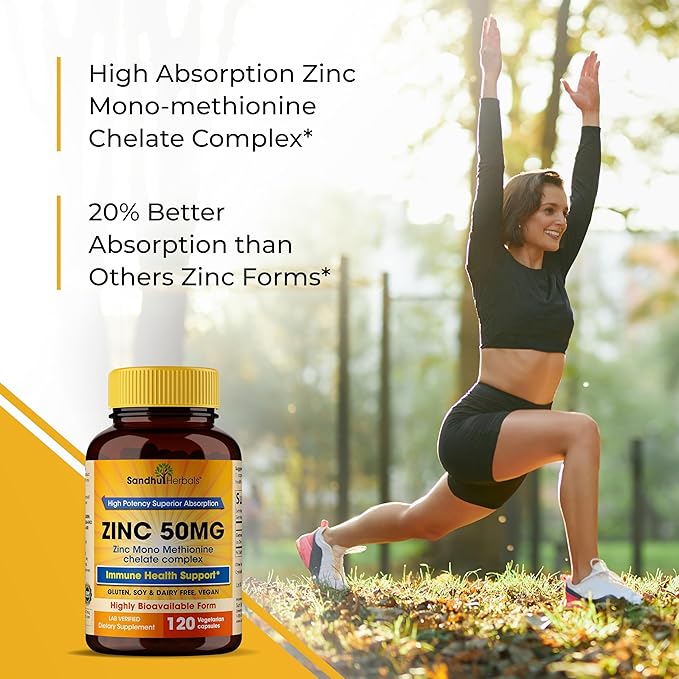 - SPECIAL FEATURES: Sandhu Herbal’s Zinc 50mg contains Zinc Monomethionine which is superior for absorption and retention as compared to other forms of zinc supplements