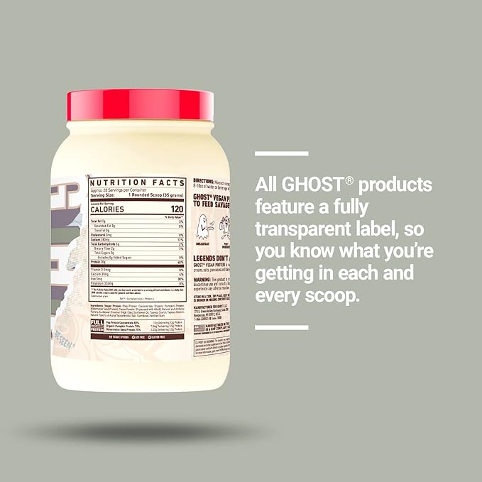 - 20G Vegan Protein: Every scoop of GHOST Chocolate Cereal Milk Vegan Protein contains 20G of pure, fully disclosed vegan protein. Flip the tub around for a breakdown of exactly how many grams of pea protein concentrate, organic pumpkin protein, and watermelon seed protein are in every scoop.