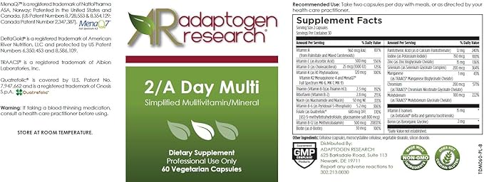2/A Day Multi | Adult Multivitamin Supplement Iron-Free with Active Folate Quatrefolic, Chelated Minerals, Vitamins A, B6, C, D, E, K, Riboflavin, Thiamin | 60 Vegetarian Capsules