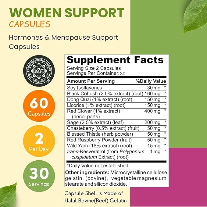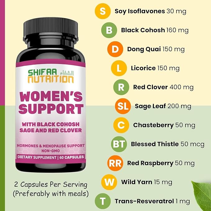 - POTENT INGREDIENTS: SHIFAA NUTRITION Women Support is A Menopause Support Supplement Made With Soy Isoflavones, Black Cohosh, Dong Quai, Licorice, Red Clover, Chasteberry, Blessed Thistle, Red Raspberry Powder, Wild Yam, and Trans-Resveratrol.