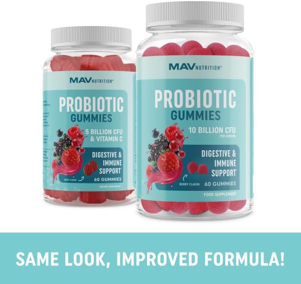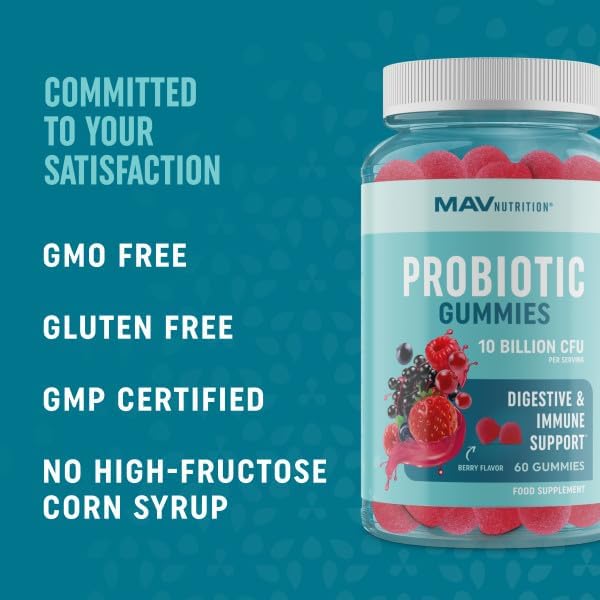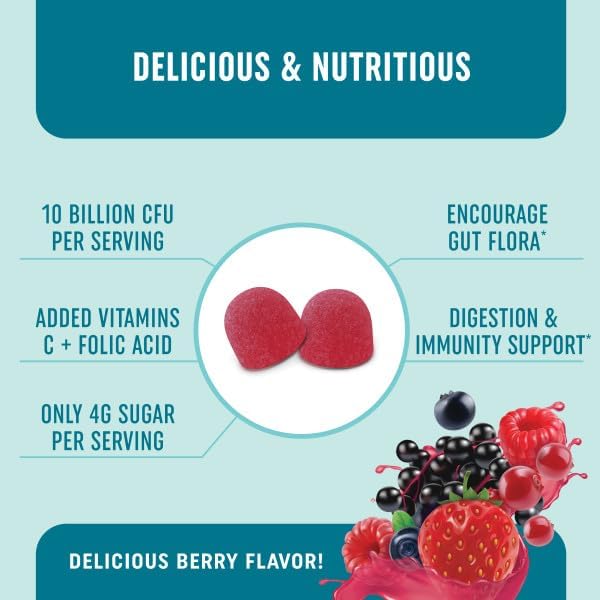 Probiotic Gummies with Vitamin C and Folic Acid | 5 Billion CFU Probiotics | Gut Health, Digestion, & Immune System Support | Gluten-Free, Non-GMO, Berry Flavor | With Organic Fruit Extracts | 60 ct.