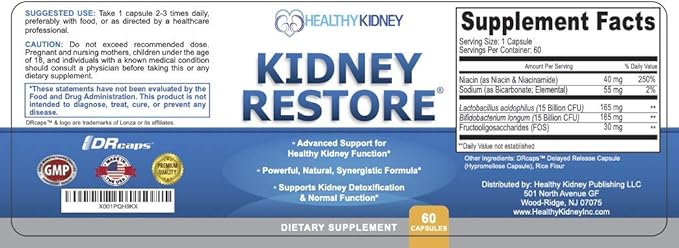- Contains certain probiotic that help by supporting the natural elimination of kidney junk in the gut; this helps by allowing them to work less & rejuvenate. The delayed release sodium bicarb neutralizes acids and unwanted stuff, balances minerals and so much more. The niacinamide supports normal phosphorus levels and aging health. A one of kind renal supplement.