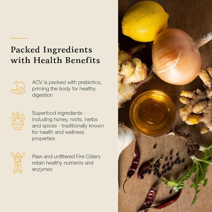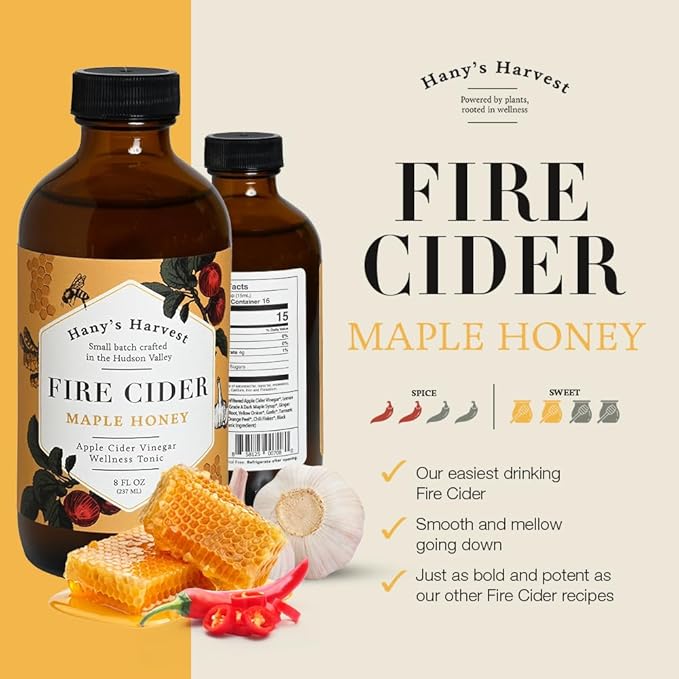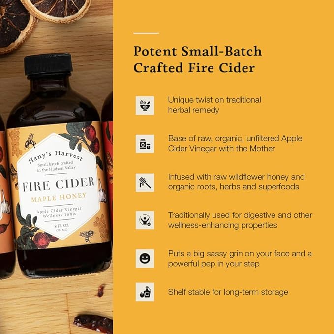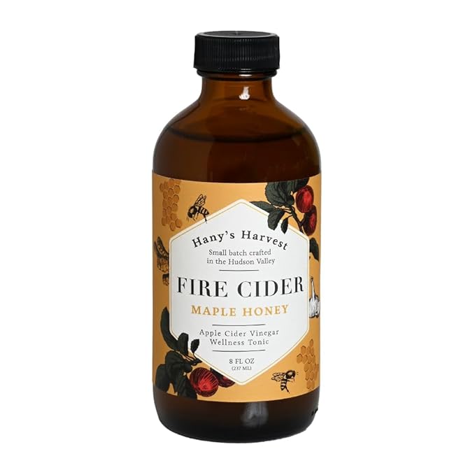 - Hany's Harvest Maple Honey Fire Cider: Our Apple Cider Vinegar is a meticulously handcrafted tonic made from apple vinegar, organic unsweetened ingredients, and a blend of natural spices. This carefully crafted small-batch wellness tonic elixir supports your immune system and aids digestion, offering a bold and spicy flavor that adds a zesty kick to your daily wellness routine.