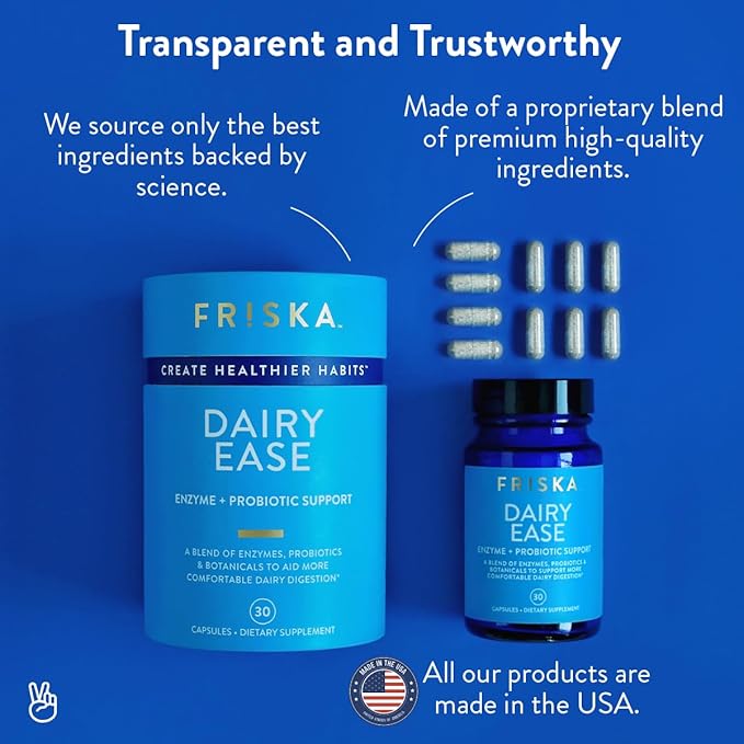 - THE CLEAN ALTERNATIVE : Natural vegetarian supplements for Dairy ease. FRISKA's proprietary blend is made in the USA from the highest quality of naturally sourced ingredients. No additives, GMO or hormones. Plant-based and easy to digest.