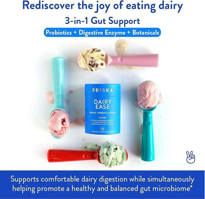 - DIGESTIVE ENZYME SUPPORT: FRISKA's multi-functioning Dairylytic digestive enzymes and potent probiotics help break down hard-to-digest proteins and lactose sugars found in dairy products. Provides natural lactase and protease support.