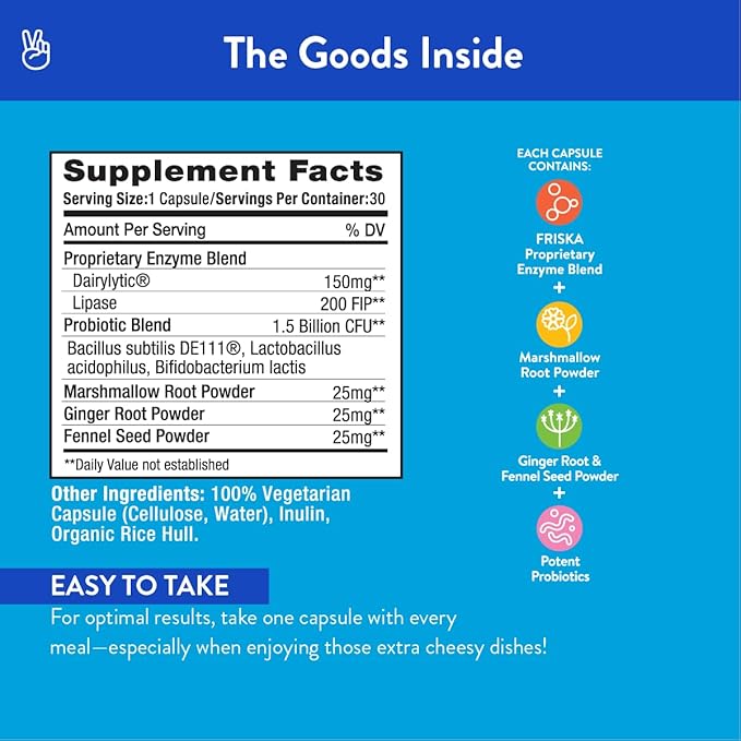 - DIGESTIVE ENZYME SUPPORT: FRISKA's multi-functioning Dairylytic digestive enzymes and potent probiotics help break down hard-to-digest proteins and lactose sugars found in dairy products. Provides natural lactase and protease support.