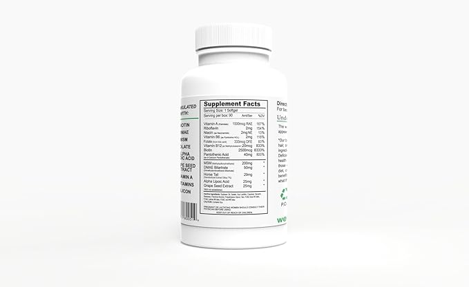 - Special Ingredients : 2500mcg Biotin, DMAE, MSM, Folate, Alpha Lipoic Acid, Grape Seed Extract, Horsetail