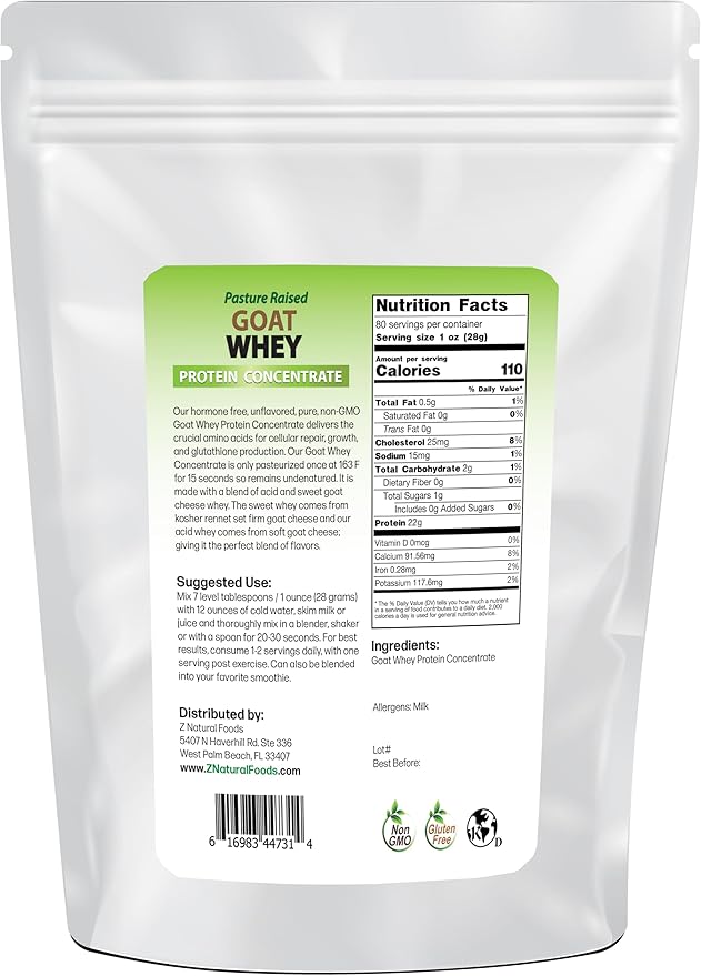 Z Natural Foods Goat Whey Protein Powder Concentrate - Undenatured, Unflavored, Pasture Raised Whey - Clean Goat Protein Powder with Vital Proteins for Weight Management, Immune Support, Fitness, 5 lb