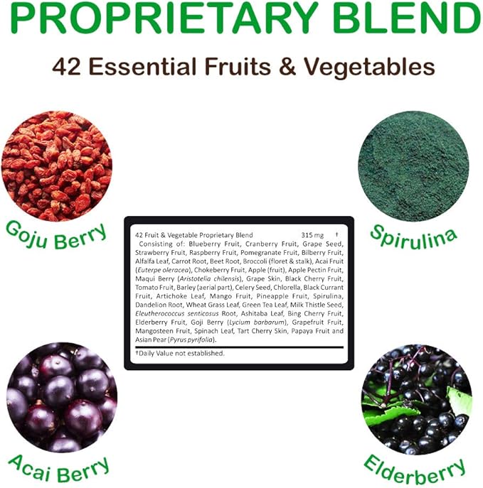 - Proprietary Blend - 42 Fruit & Vegetables including Elderberry , Acai , Goji Berry, Spirulina & More