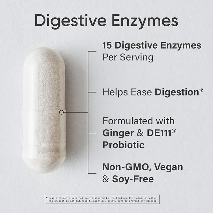 - BEAT THE BLOAT: Replenishes enzymes that may decline with age. Our plant-based digestive enzymes with probiotics and ginger work synergistically to help tackle hard-to-digest foods and stomach bloating*