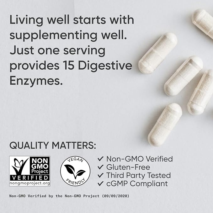 - QUALITY ASSURED: We hold all of our supplements to a higher standard. Rest assured that your digestive enzymes capsules are manufactured in a cGMP-compliant USA facility and third-party tested for quality. Our digestive enzymes capsules are Non-GMO Project Verified, Vegan Friendly, and free of gluten, soy, and unwanted fillers
