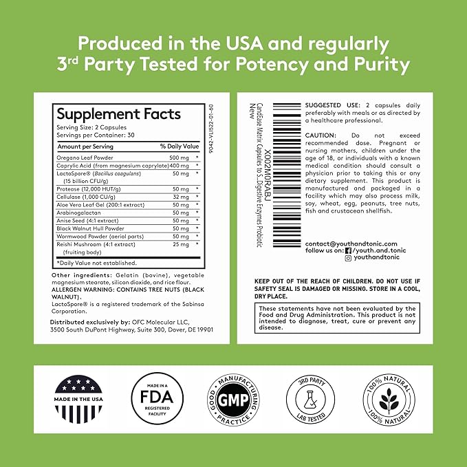Youth & Tonic CandEase Cleanse Matrix – Overgrowth Support & Gut Health, Intestinal Flora Balance & Body Detox Complex with Oregano, Caprylic Acid, Digestive Enzymes, Probiotics, 60 Pills, Women & Men