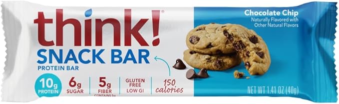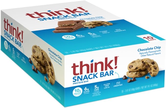 think! Protein Bars with Chicory Root for Fiber, Digestive Support, Gluten Free with Whey Protein Isolate, Chocolate Chip, Snack Bars without Artificial Sweeteners, 1.4 Oz (10 Count)