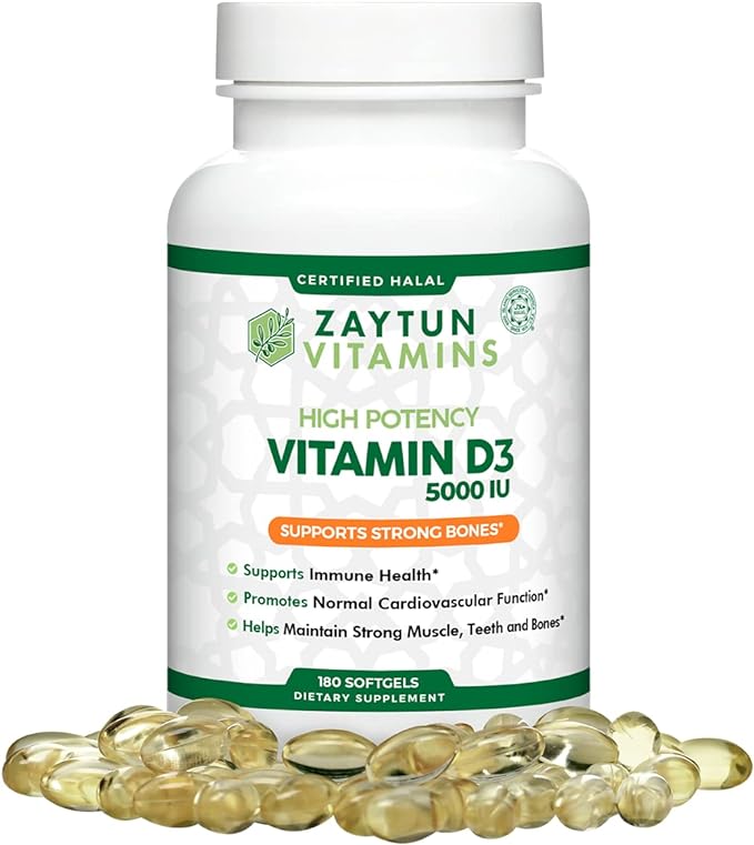 - STRONG BONES & MUSCLES: Our Halal Vitamin D3 5000 IU supplement provides a potent daily dose of Vitamin D3 in 180 mini softgels, supporting strong bones, healthy muscle function, and overall bone health.