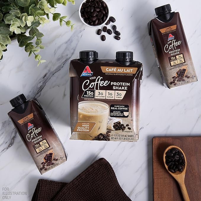 - AT HOME OR ON-THE-GO. Atkins Café au Lait Iced Coffee Protein Shakes. Enjoy delicious shakes that fit right into your busy schedule, with 15g of protein, 3g of net carbs, 1g of sugar per serving*, and as much caffeine as a cup of coffee.