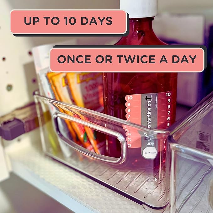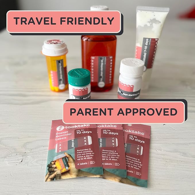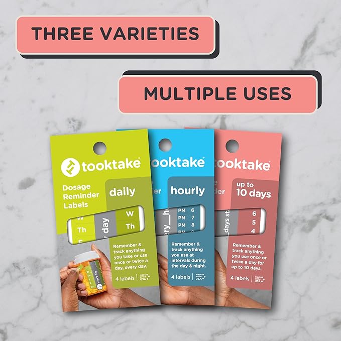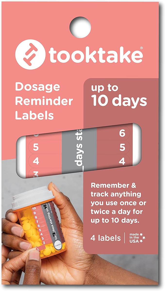 - 4 LABELS PER PACK / TOOKTAKE 10 DAY labels are great if you need to take a dose once or twice a day for up to 10 days. Anything you need to take am/pm. For short-term medications. For those of us who aren’t used to taking medication, this addition to our daily routine can be challenging. Tooktake stickers make it easy to track liquid meds too! Replaces vitamin organizer 7 day, Monday through Sunday pill organizer,pill sorter