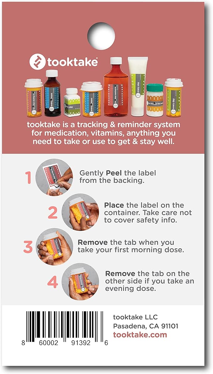 - NO TECH, NO BATTERIES!: You don’t have to be tech-savvy! Just stick a tooktake label on any package. It works for pills, gummies, liquids lotions, spray drops, and anything that you need to take or use! Unlike medication reminder apps or pill reminder alarms, you can’t turn it off when it “beeps” and still forget to take your medication! Best Pill/ Medicine organizer for short-term meds once or twice a day am/pm!