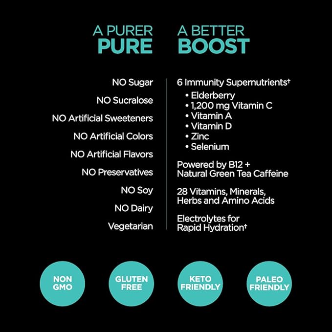 - Boost Your Energy + Immune System. Up to 6 hours of powerful clean, immune boosting energy* now packed with 28 vitamins, minerals and supernutrients like Elderberry, 1200mg of Vitamin C, Vitamin D, Vitamin A, Selenium and Zinc! Powered by natural green tea caffeine and B12 plus contains electrolytes for rapid hydration.
