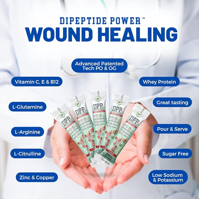 - PROMOTES WOUND HEALING: The unique blend of dipeptides, collagen, and whey protein in this supplement has been shown to promote wound healing, making it a valuable supplement for individuals with pressure ulcers stages II, III, & IV, deep tissue/unstageable wounds, geriatrics with decreased blood flow and skin elasticity, and immunocompromised/diabetes. Clinically supported in peer reviewed published studies.