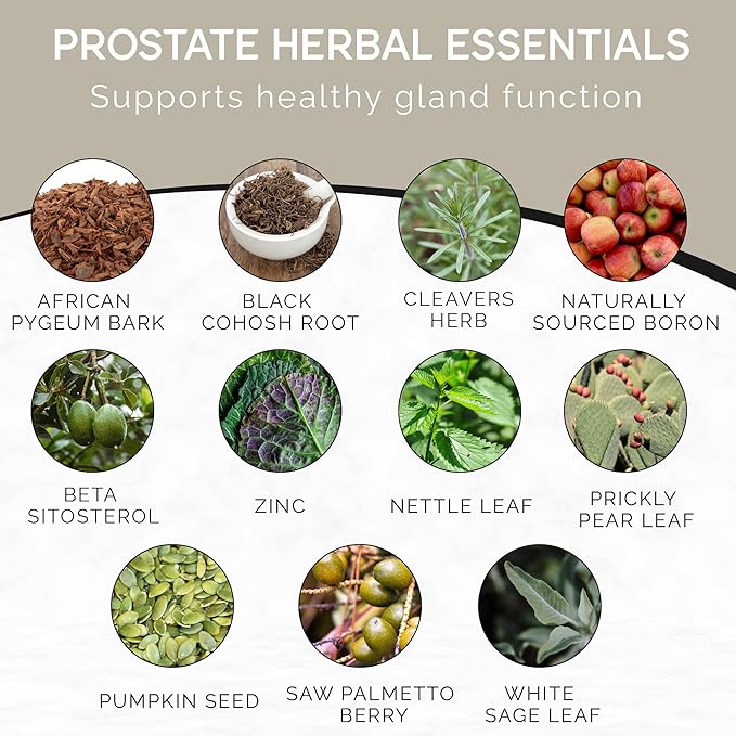 - [WE’VE MADE IT EASY FOR YOU] By combining 8 nature’s frequently tested herbs in one PHYSICIAN-FORMULATED ORGANIC BLEND. 100% PLANT BASED with Saw Palmetto Berry, African Pygeum Bark, Nettle Leaf, Beta-Sitosterol, Pumpkin Seed, Wildcrafted White Sage, Black Cohosh Root, Cleavers Herb, Prickly Pear Leaf & Naturally Sourced Zinc and Boron.