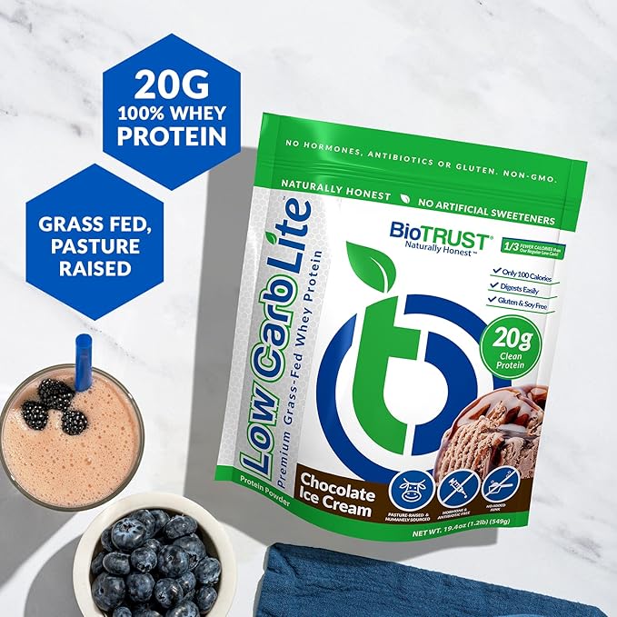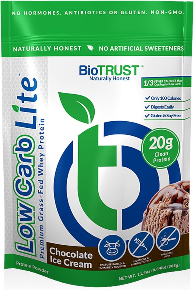 BioTrust Low Carb Lite, 20 Grams of Grass-Fed Whey Protein Isolate, 100 Calories, ProHydrolase Digestive Enzymes, Non-GMO, Free from Soy and Gluten, rBGH-Free (14 Servings) (Chocolate Ice Cream)