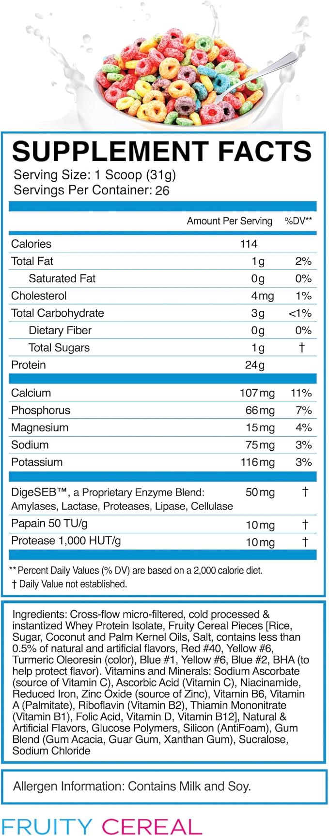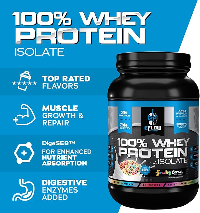 eFlow Nutrition 100% Whey Protein Isolate - Gluten & Lactose-Free Digestive Enzymes Added, Low Carb, Post Workout Shake, Fast Digesting for Optimal Muscle Recovery - Fruity Cereal (26 Servings)