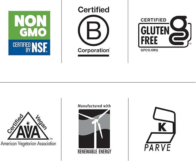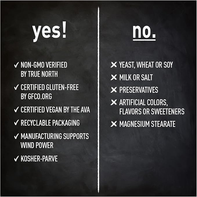 - Responsibly made - Certified Non-GMO Verified, Glute Free, Vegan and Kosher made with recyclable packaging the manufacturing of this product supports wind power. This product does not contain yeast, corn, wheat, soy, milk, preservatives or artificial colors, flavors or sweeteners.