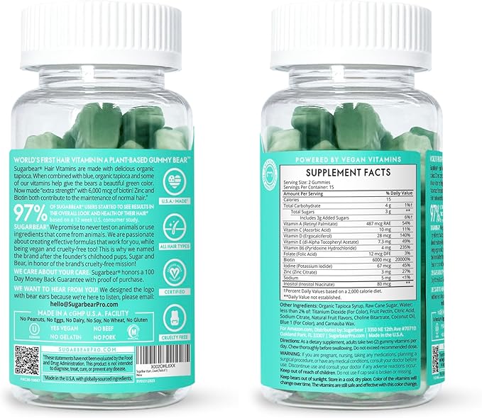 Sugarbear Hair Vitamin Gummy 1 Month Supply & 1 Pure Batana Natural Hair Growth Oil-Extra Strength Biotin 6000mcg, Women, Men, Vegan Vitamin B12, MSM, Inositol, Elderberry, Kosher, Halal, Cruelty-Free