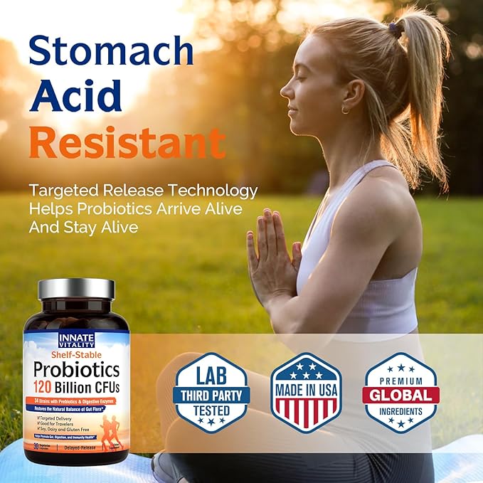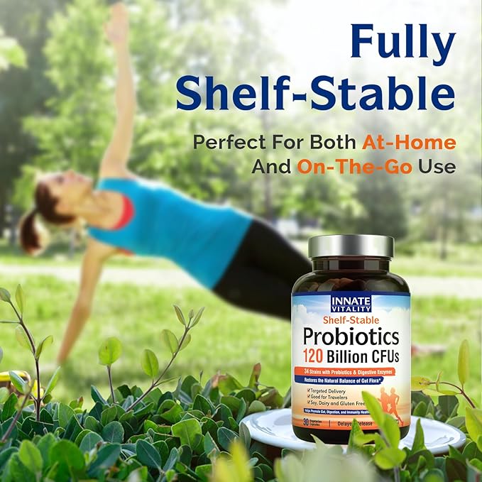 Innate Vitality Probiotics 120 Billion CFUs for Men & Women, 34 Strains with Prebiotics & Digestive Enzymes, Immune & Digestive Health, Delayed Release, Shelf Stable, 30 Vegan Capsules