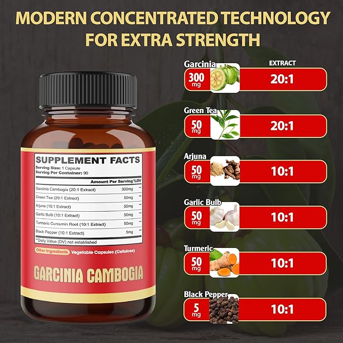 - ✅ Potent Garcinia Cambogia Supplement with extracted powder ingredients, including Garcinia Cambogia powder, Green Tea, Arjuna Powder, Garlic Bulb, Turmeric Curcumin Root, and Black Pepper; A great choice for elevating your well-being.