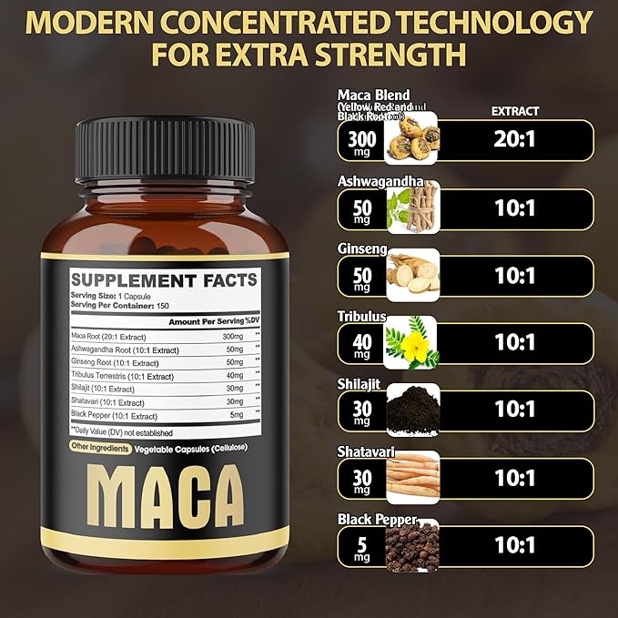 - ✅ Potent Maca Root Supplements with extracted powder ingredients, including Maca Root extract, Ashwagandha Root, Ginseng, Tribulus Terrestris, Shilajit, Shatavari Powder and Black Pepper; A great choice for elevating your well-being.
