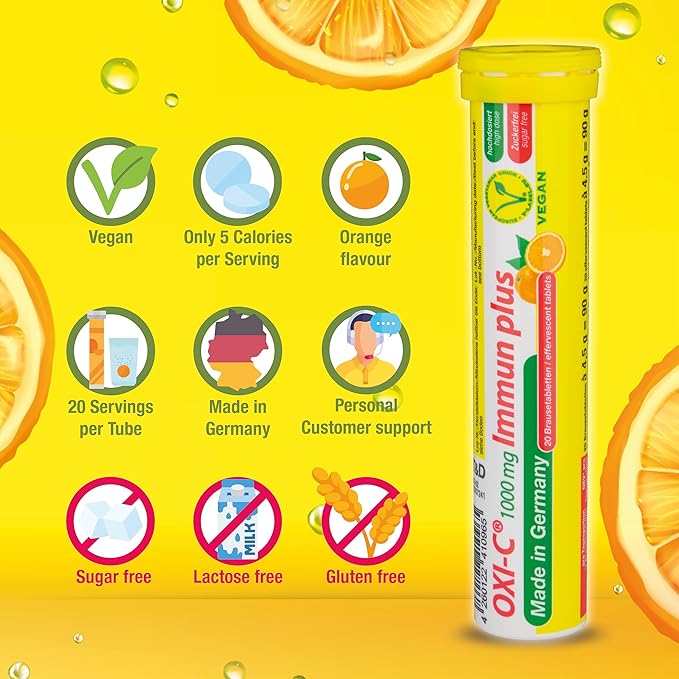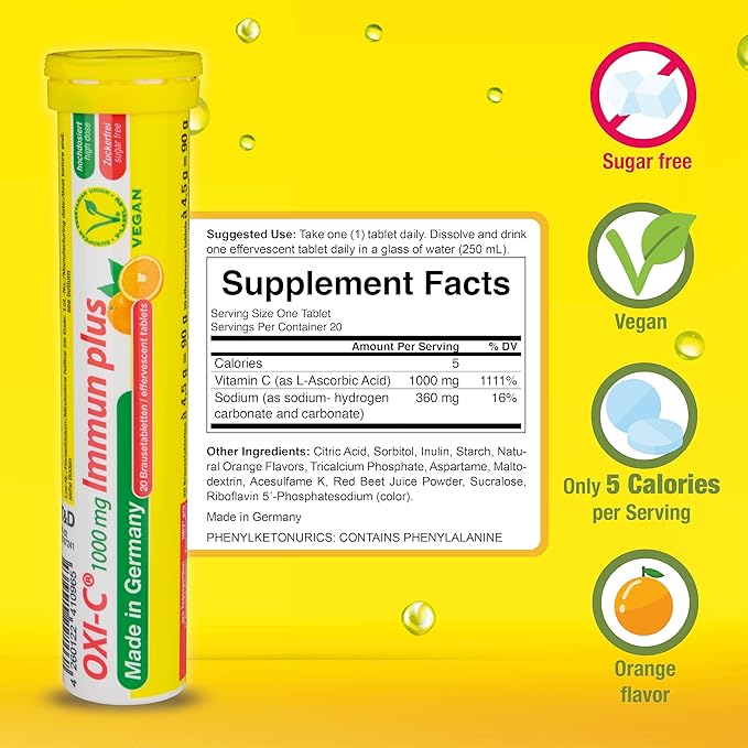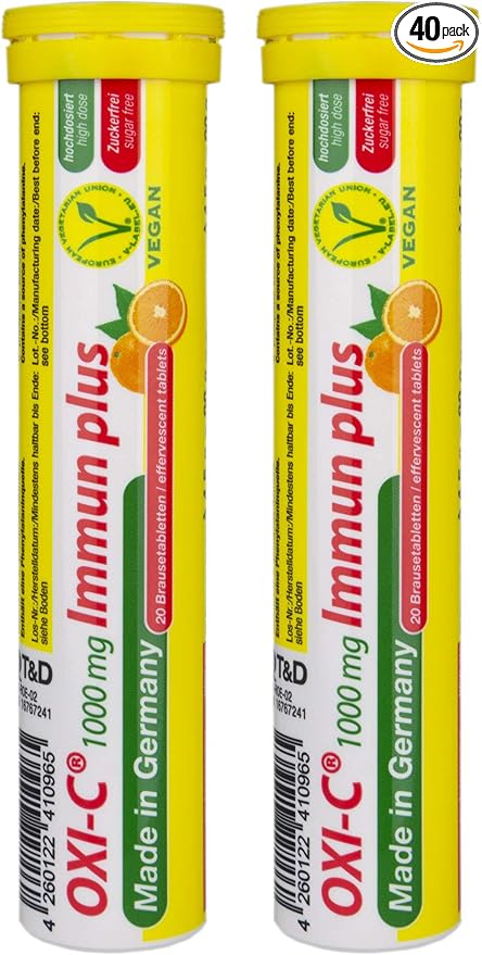 T&D Oxi C 1000 mg Vitamin C - 40 Vegan Drink Effervescent Tablets - Orange Flavor - Made in Germany