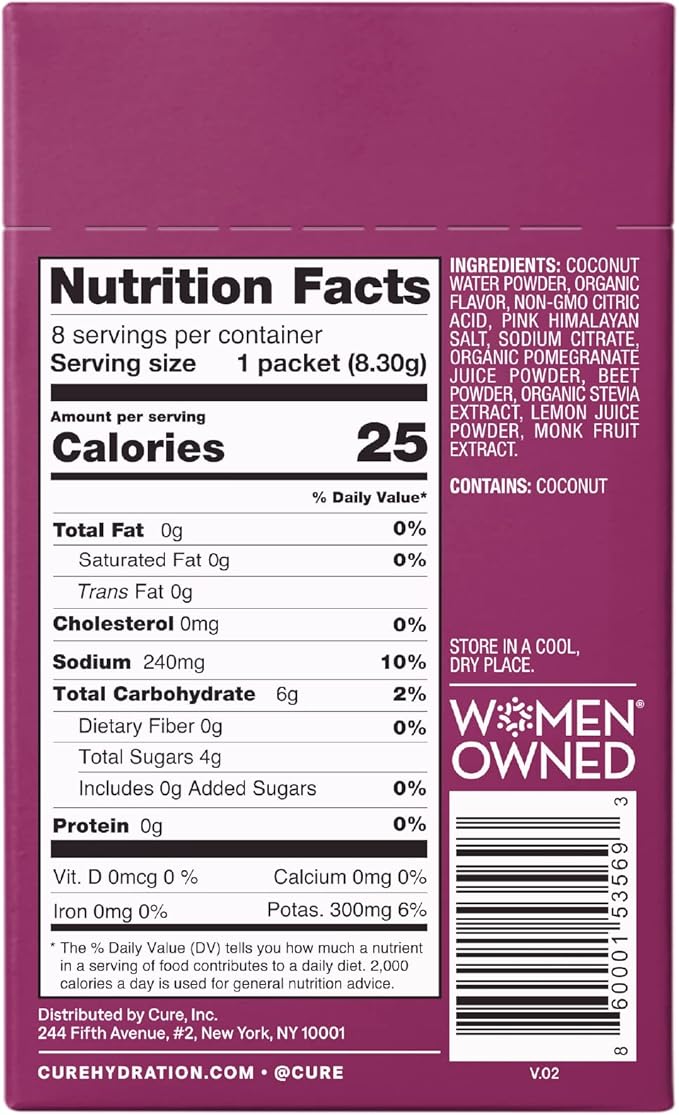 Cure Hydrating Plant Based Electrolyte Mix | Powder for Dehydration Relief | Made with Coconut Water | Non-GMO | No Added Sugar | FSA & HSA | Vegan | Box of 8 Packets - Berry Pomegranate