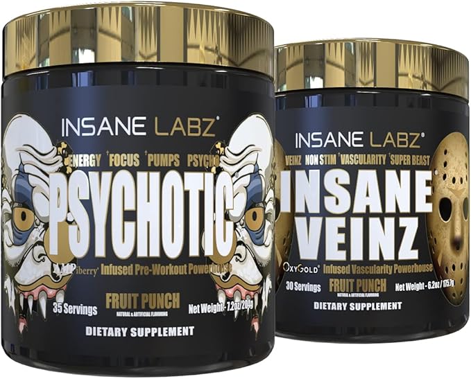 Insane Labz Psychotic Gold and Insane Veinz Gold Pre Workout Nitric Oxide Booster Stack, Increase Muscle Mass, Vascularity, Strength, Energy, Focus, Fruit Punch
