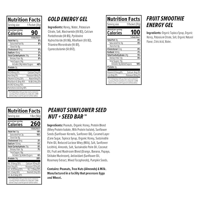 - Package contains 1 Unit each of: honey waffle, Salted Caramel waffle, fruit smoothie energy chew, pomegranate passionfruit energy chew, Gold energy Gel, fruit smoothie energy Gel, peanut & sunflower Nut and Seed bar