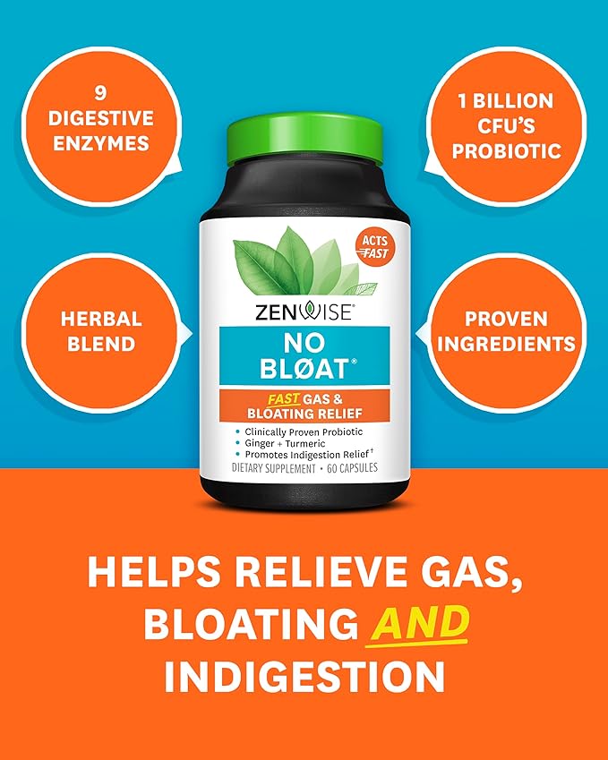 Zenwise Health NO Bloat Probiotics for Women and Men Digestive Health with Ginger, Dandelion, and Lactase, Digestive Enzymes for Gas and Bloating Relief - Vegan Water Retention Pills - 60 CT