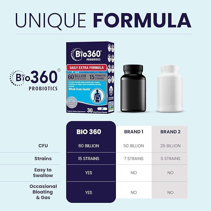 - INGREDIENTS YOU NEED: Bio360 Extra Strength Formula includes Bifidobacterium probiotic along other powerful probiotics like Lactobacillus acidophilus, salivarius, casei, and fermentum all combined to create a perfect solution for your gut health needs.