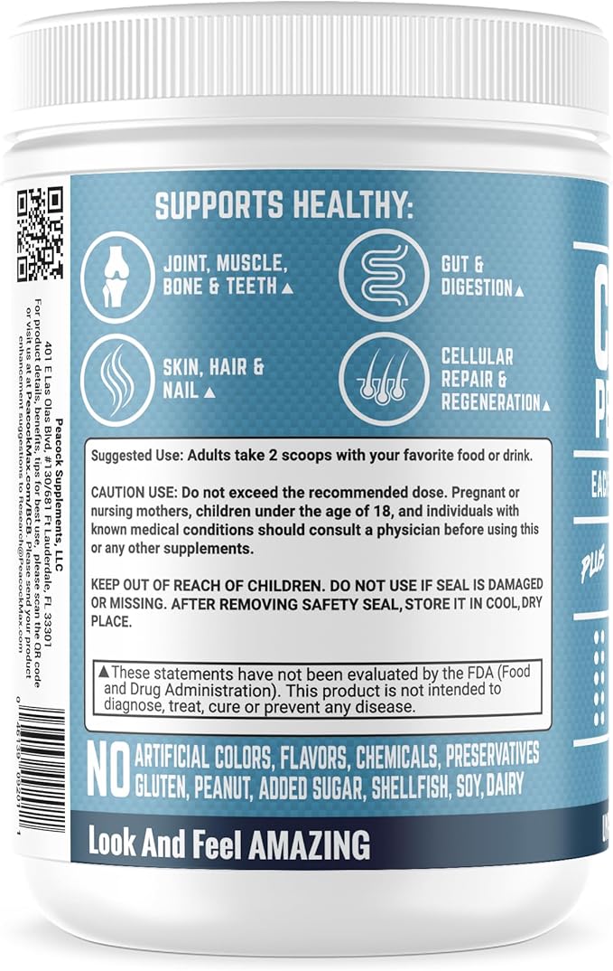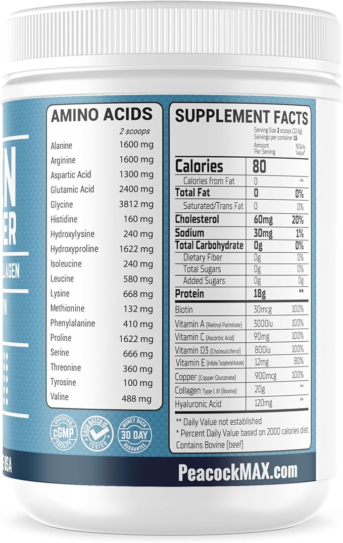 - Clean, Natural, and Trustworthy: Peacock Max Collagen Peptides Powder is made in the USA and is free from artificial colors, flavors, preservatives, gluten, soy, dairy, peanuts, and shellfish. Designed with a focus on purity and quality, it contains no added sugars, making it suitable for keto-friendly and clean eating lifestyles.