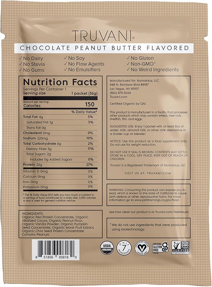 Truvani Vegan Pea Protein Powder | Chocolate Peanut Butter | 20g Organic Plant Based Protein | 1 Serving | Keto | Gluten & Dairy Free | Low Carb | No Added Sugar