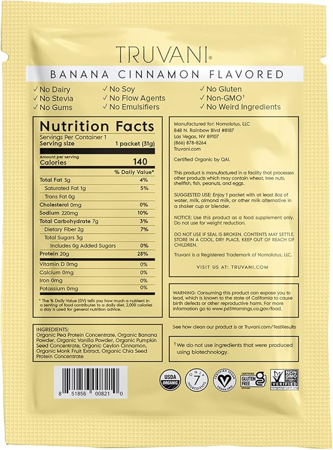 Truvani Vegan Pea Protein Powder | Banana Cinnamon | 20g Organic Plant Based Protein | 1 Serving | Keto | Gluten & Dairy Free | Low Carb | No Added Sugar