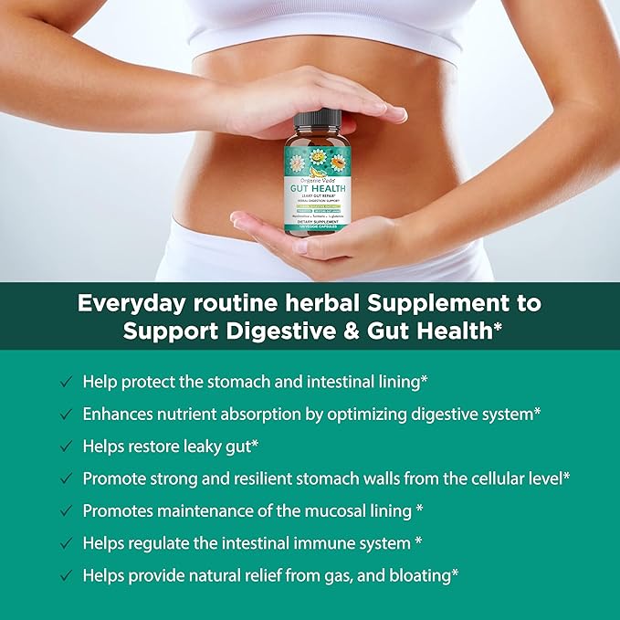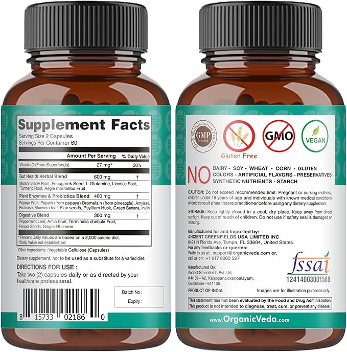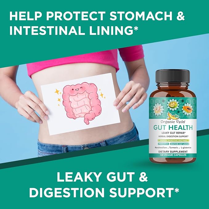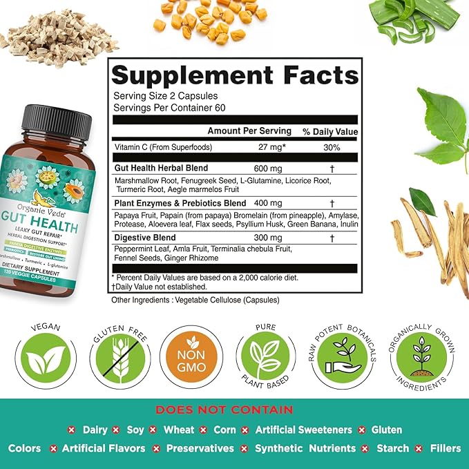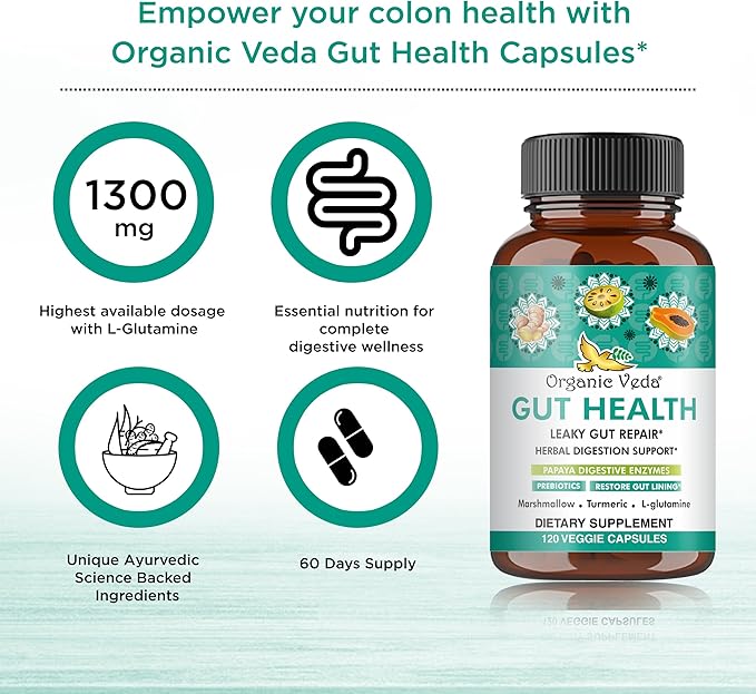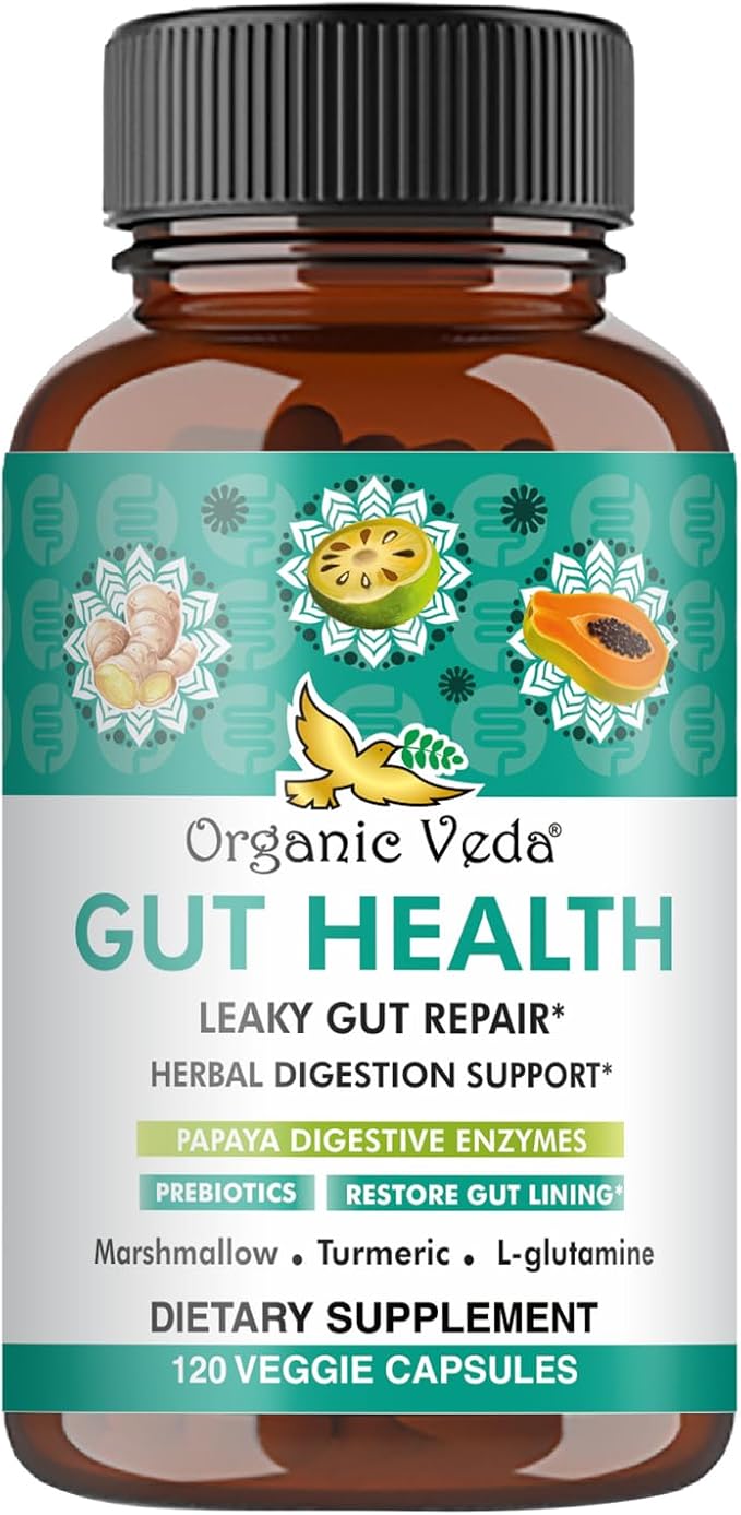 Organic Veda Gut Health Supplement - Leaky Gut Repair Capsules with Papaya Digestive Enzymes, Prebiotics, L-Glutamine, Turmeric - Support Bowel Movement & Cleanse Colon - 120 Count