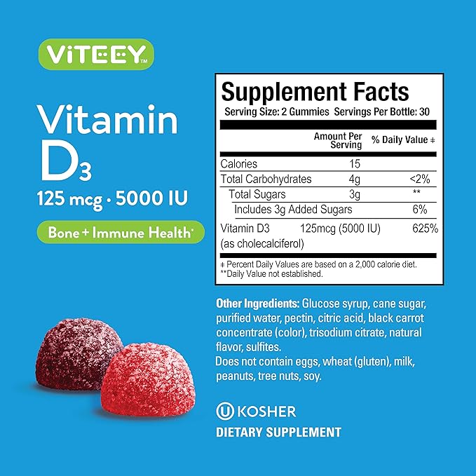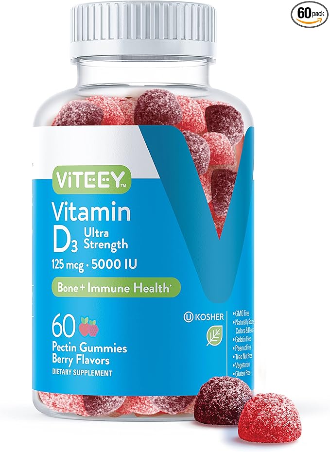 - SOURCED FROM ALL-NATURAL INGREDIENTS - Viteey's Vit D3 Gummies are peanut-free, tree nut-free, non-GMO, gluten-free, gelatin-free, and vegetarian. Each chewable vitamin d supplement contains naturally sourced colors and flavors.