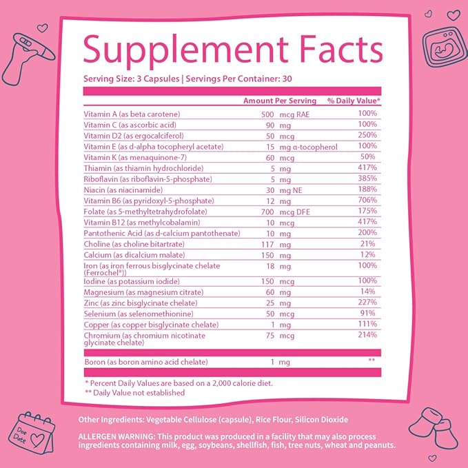 - Only Essentials - Contains no fillers. Designed to be gentle and easy on your stomach. Take 3 prenatal pills daily and get all of the nutrition missing in your food