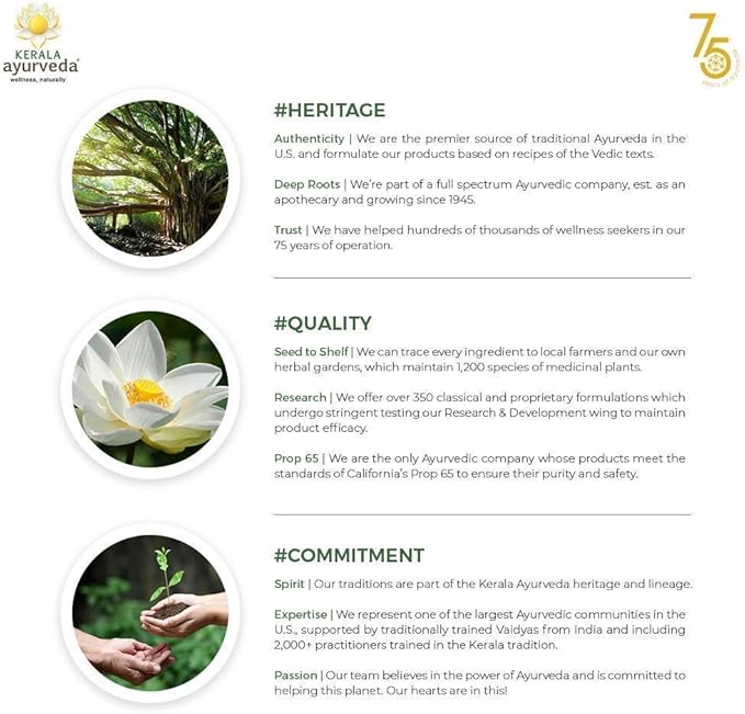 - KERALA AYURVEDA HERITAGE: With a rich legacy spanning over 80 years, we are pioneers in Authentic Ayurveda and experts in holistic healing. Our products are natural, herbal and plant based. They are a perfect blend of classic with a modern touch to compliment your active lifestyle.