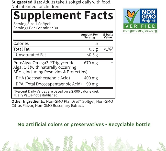 - OMEGA VEGAN SUPPLEMENT WITH DHA FOR BRAIN AND HEART: Delivers over 400 mg total Omega-3s with naturally occurring Specialized Pro-Resolving Mediators (SPM)—compounds that support the body's normal inflammatory responses—including Resolvins and Protectins