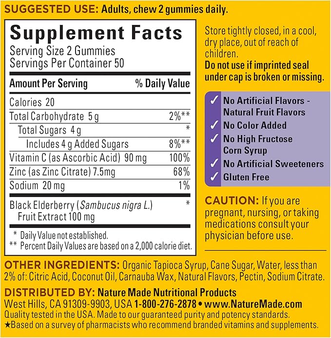 - Antioxidant and immune support supplement: contains one 100 count bottle of Nature Made Elderberry with Vitamin C and Zinc Gummies for a 50-day supply