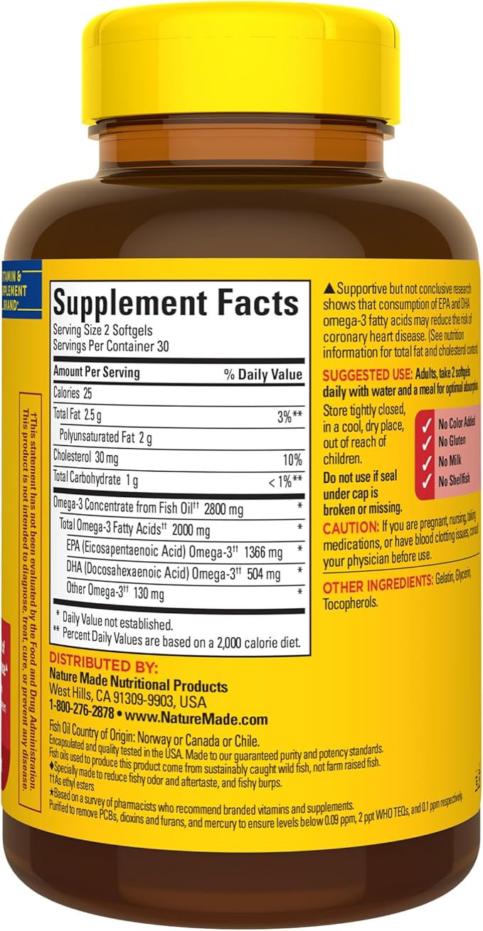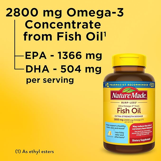 - Brain, Eye, Heart, and Mood supplement: contains one 60 count bottle of Nature Made Extra Strength Omega 3 (1) from Fish Oil 2800 mg per serving Softgels for a 30-day supply