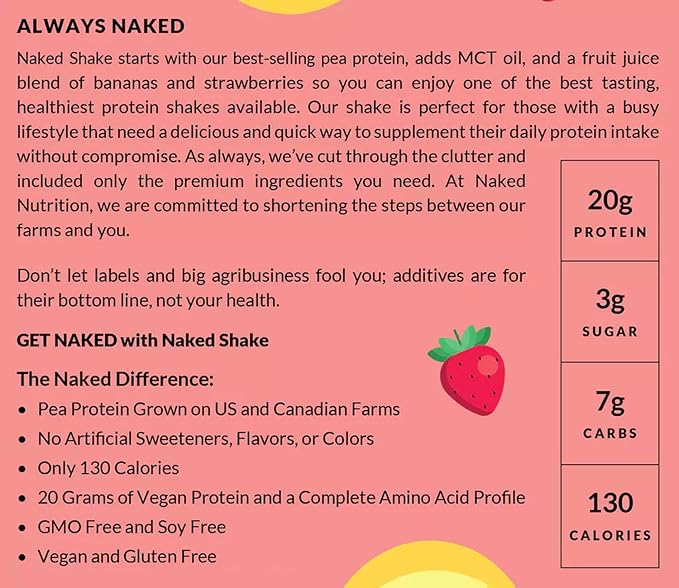 Naked Shake - Vegan Protein Powder, Strawberry Banana - Flavored Plant Based Protein with Mct Oil, Gluten-Free, Soy-Free, No Gmos Or Artificial Sweeteners - 30 Servings